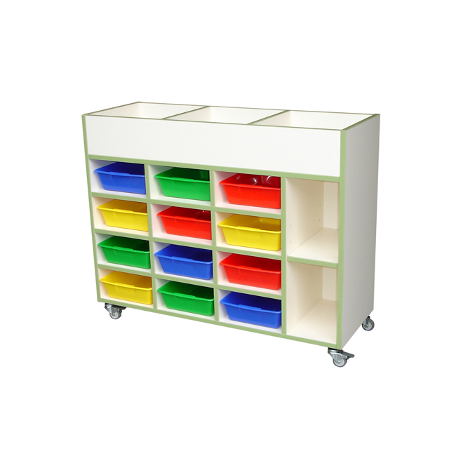 Tanto el armazón como las baldas y zócalo estarán construidos en tablero de madera aglomerada de espesor nominal de 19 mm. Consta de 2 compartimentos diferenciados: el superior está destinado a contener-exponer libros y cuentos, dividido en 4 zonas de iguales dimensiones y en sentido transversal, con una profundidad de 160 mm. El compartimento inferior contiene 12 gavetas de plástico en tres columnas de cuatro, y una cuarta columna con un estante regulable en tres posiciones en su zona central. La trasera es de tablero de madera aglomerada de 10 mm de espesor e irá engargolada y encolada para proporcionar rigidez al conjunto.