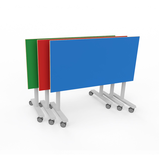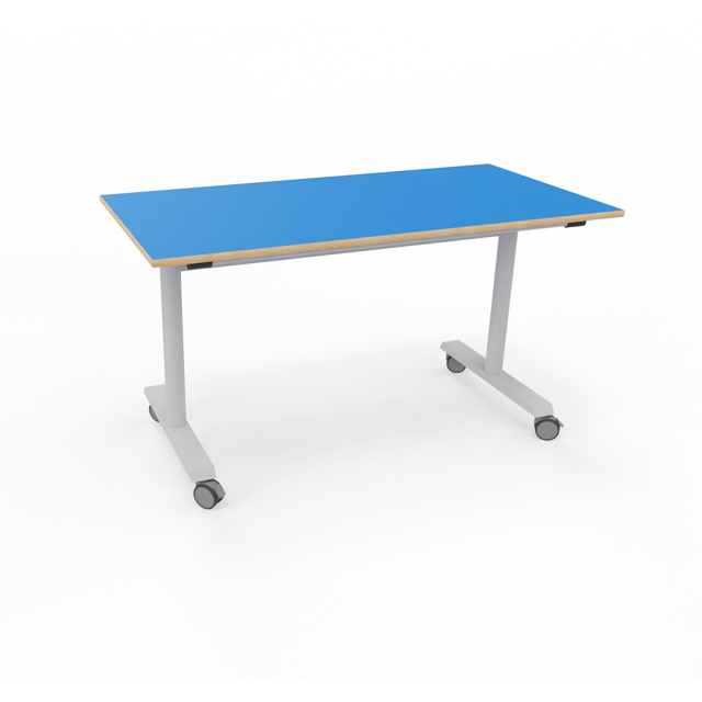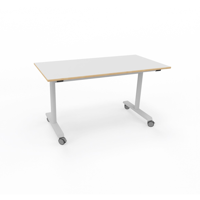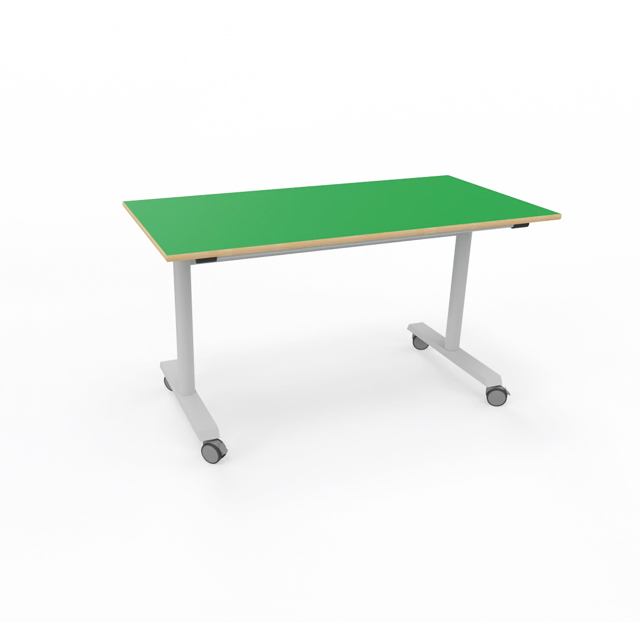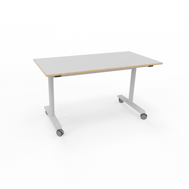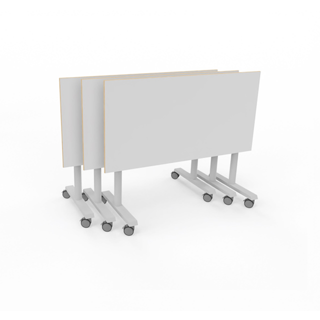 Mesa con tapa abatible y ruedas. La tapa abate verticalmente mediante un sencillo mecanismo con tirador de barra longitudinal, permitiendo adosar varias mesas en muy poco espacio. Estructura metálica 60mm pintada en epoxi. Ruedas con freno. Tapa fabricada en tablero estratificado con cantos de madera de haya.