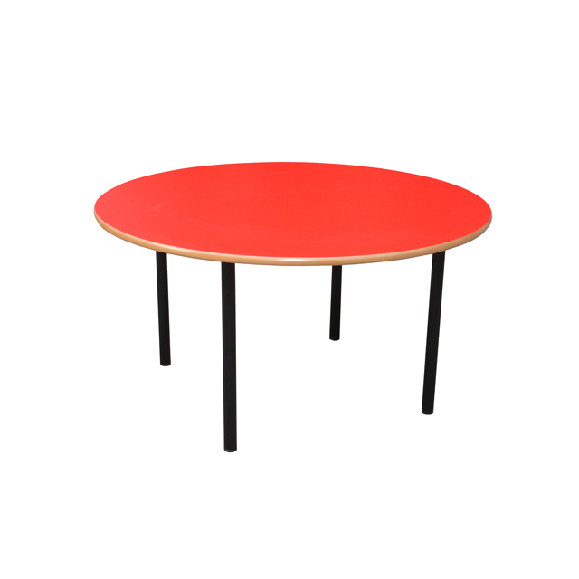 Mesa circular para aulas de infantil. Estructura metálica 35mm pintada en epoxi. Tapa fabricada MDF con laminado estratificado HPL con cantos mecanizados y barnizados.