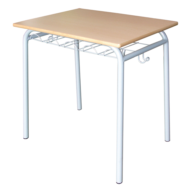Conjunto formando por pupitre + silla de altura correspondiente. Homologado según normas: UNE EN 1729-2:2012+A1:2016, UNE EN 1729-1:2007 y UNE EN 1728:2013. Estructura metálica Ø28mm soldada pintada en epoxy. Tapa fabricada en laminado estratificado HPL con cantos cabeceados en madera de haya, mecanizados y barnizados. Bandeja portalibros de parrilla metálica con dos ganchos. Silla escolar homologada. Estructura metálica soldada pintada en epoxy. Asiento y respaldo laminados estratificados sobre base contrachapada de 10mm.