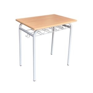 Pupitre escolar homologado extra alto, altura 80cm. Estructura metálica Ø28mm soldada pintada en epoxy. Tapa fabricada en laminado estratificado HPL con cantos cabeceados en madera de haya, mecanizados y barnizados. Bandeja portalibros de parrilla metálica con dos ganchos. Se entrega completamente montado
