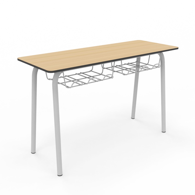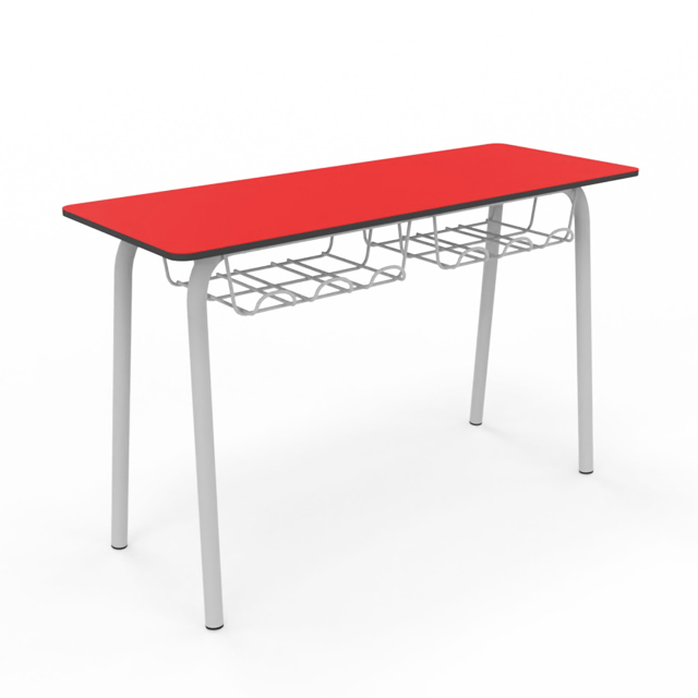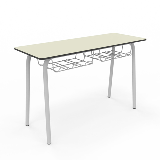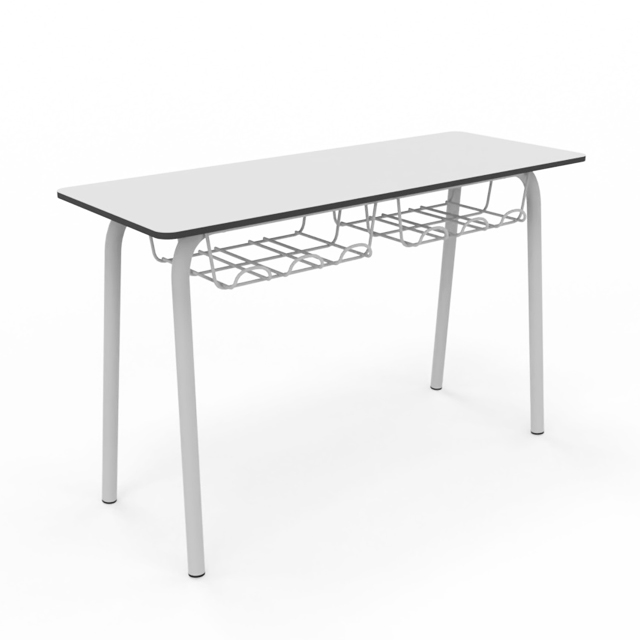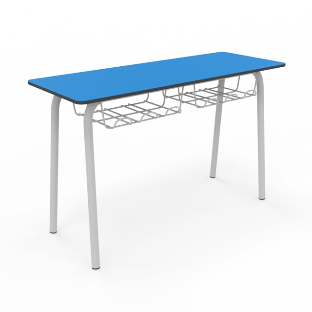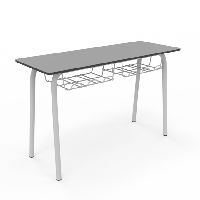 Pupitre bipersonal para aulas de aprendizaje individual o cooperativo. Tapa de 120x45cm y disponible en todas las alturas homologadas. Estructura metálica Ø35mm soldada pintada en epoxy. Tapa fabricada en Compac Plus HPL® de 14mm con cantos mecanizados en redondo. Bandeja portalibros de parrilla metálica.