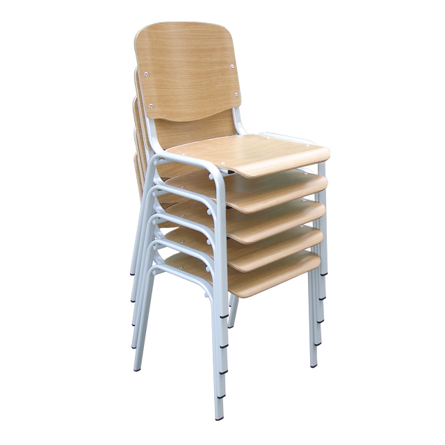 Silla escolar con estructura metálica soldada de tubo oval pintada en epoxy. Asiento y respaldo laminados estratificados HPL sobre base contrachapada de 10mm. Patas con conteras antisonoras. Apilable.